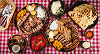 Verschiedene gegrillte Fleischsorten mit Beilagen.
