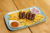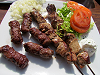 Fleischspieß und Cevapcici mit Beilagen.
