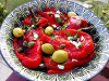Grüne Oliven mit Paprika und Brot.